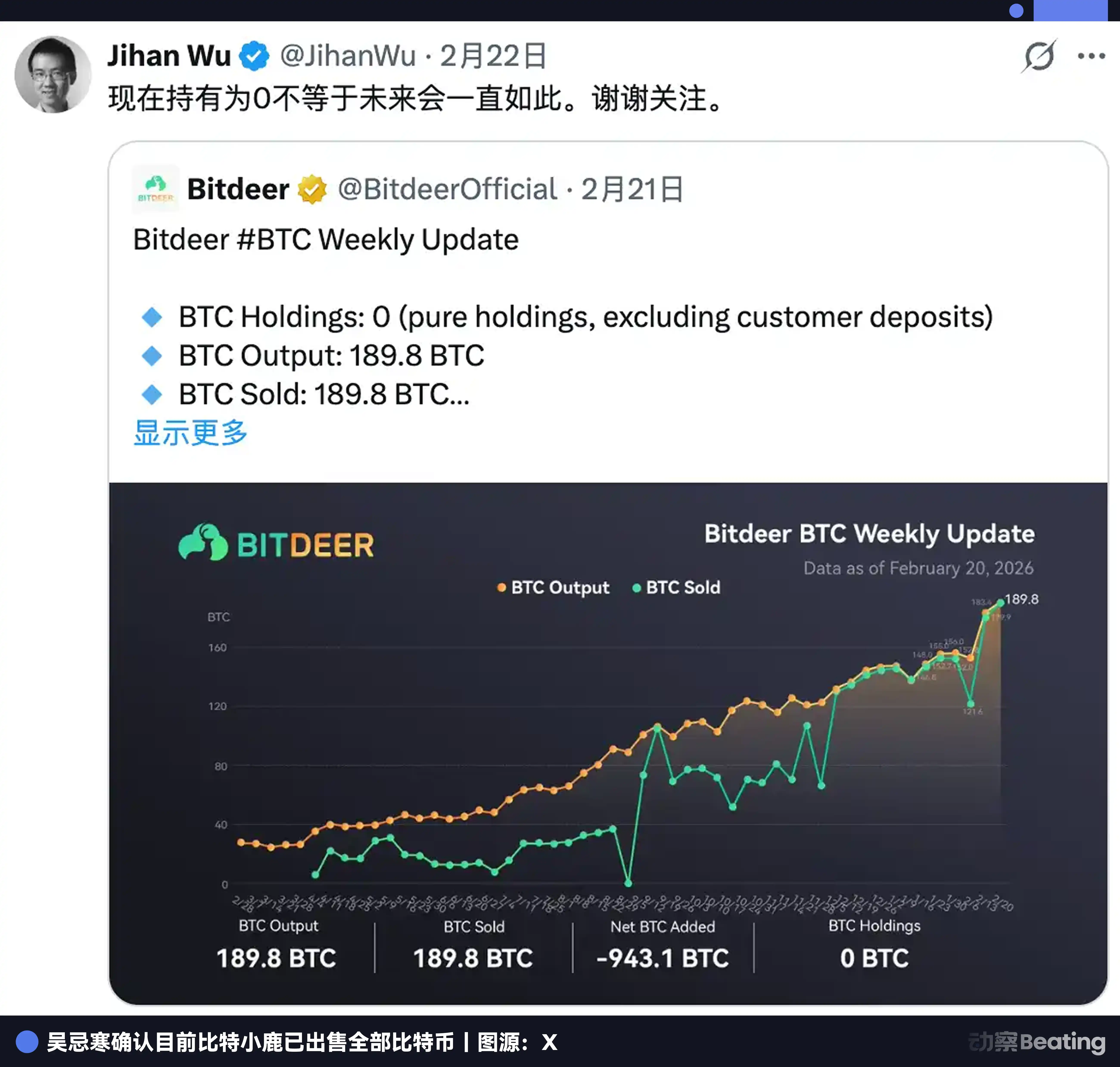2026 年 2 月 20 日,比特小鹿在 X 上发布了当周产量更新:当周自挖 189.8 枚 BTC,卖了。剩余库存 943.1 枚,一次性卖了。