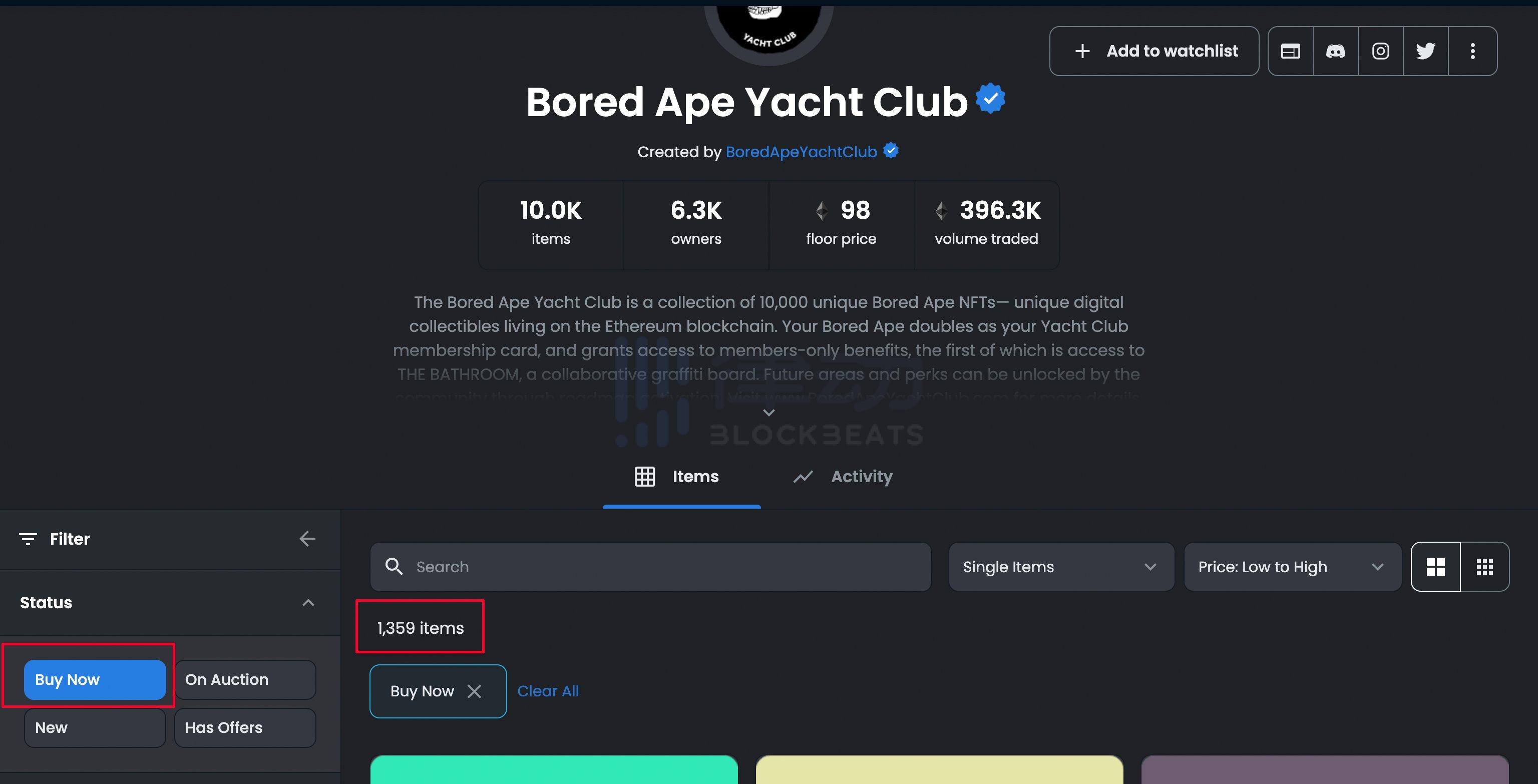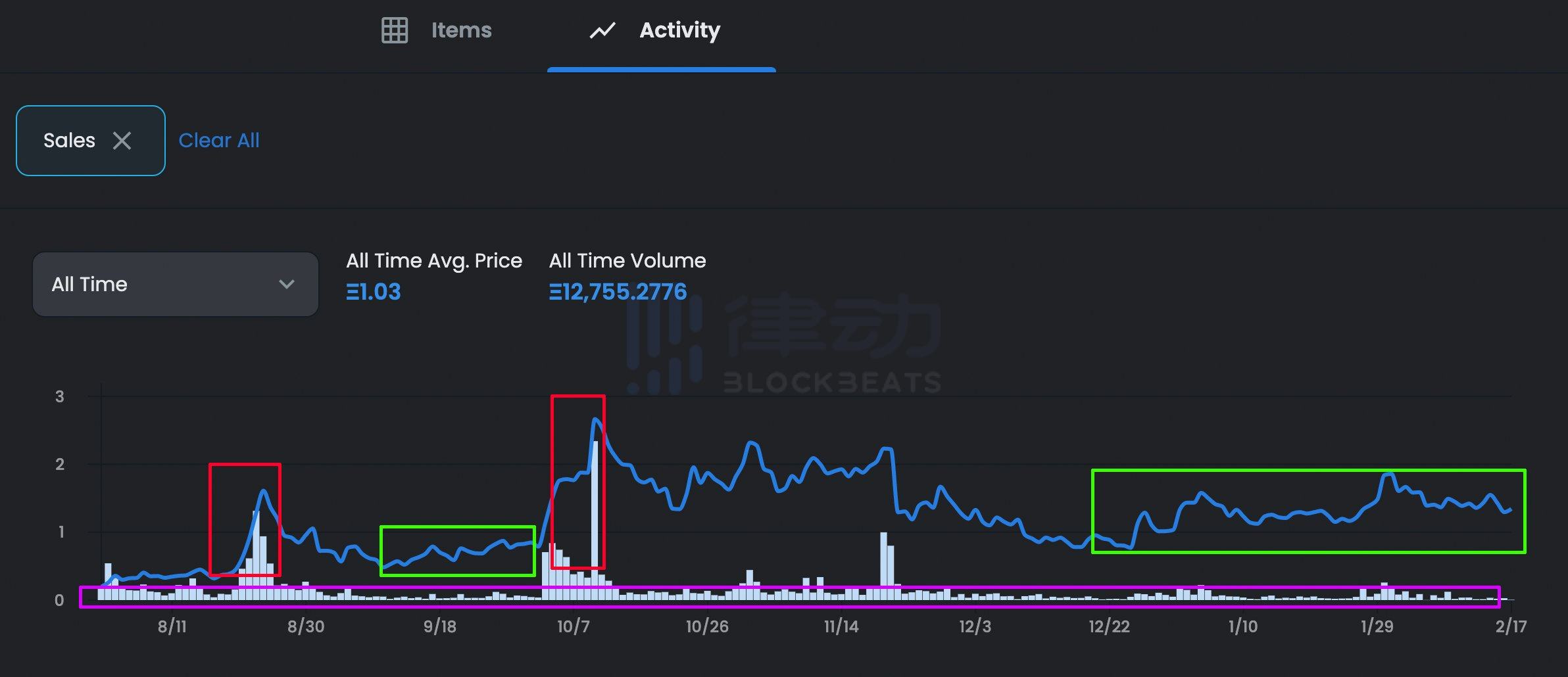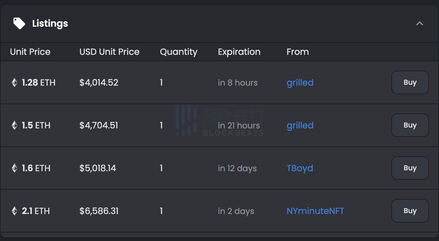 很显然,列出的数量越少,卖家也就越少。如果我想买入一个项目,就会密切关注这一点,以判断一个项目的热度。随着列出数量的下降,价格的上涨也会变得更加容易。