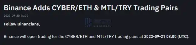 据官方公告,Binance 将于北京时间 9 月 21 日 16:00 上线 CYBER/ETH、 MTL/TRY 交易对。