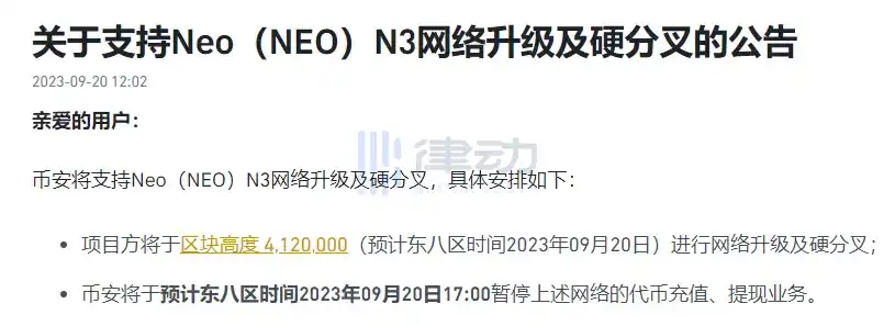 据官方公告,Binance 将支持 Neo(NEO)N3 网络升级及硬分叉,具体安排如下: -项目方将于区块高度 4,120,000(预计东八区时间 2023 年 09 月 20 日)进行网络升级及硬分叉; -Binance 将于预计东八区时间 2023 年 09 月 20 日 17:00 暂停上述网络的代币充值、提现业务。