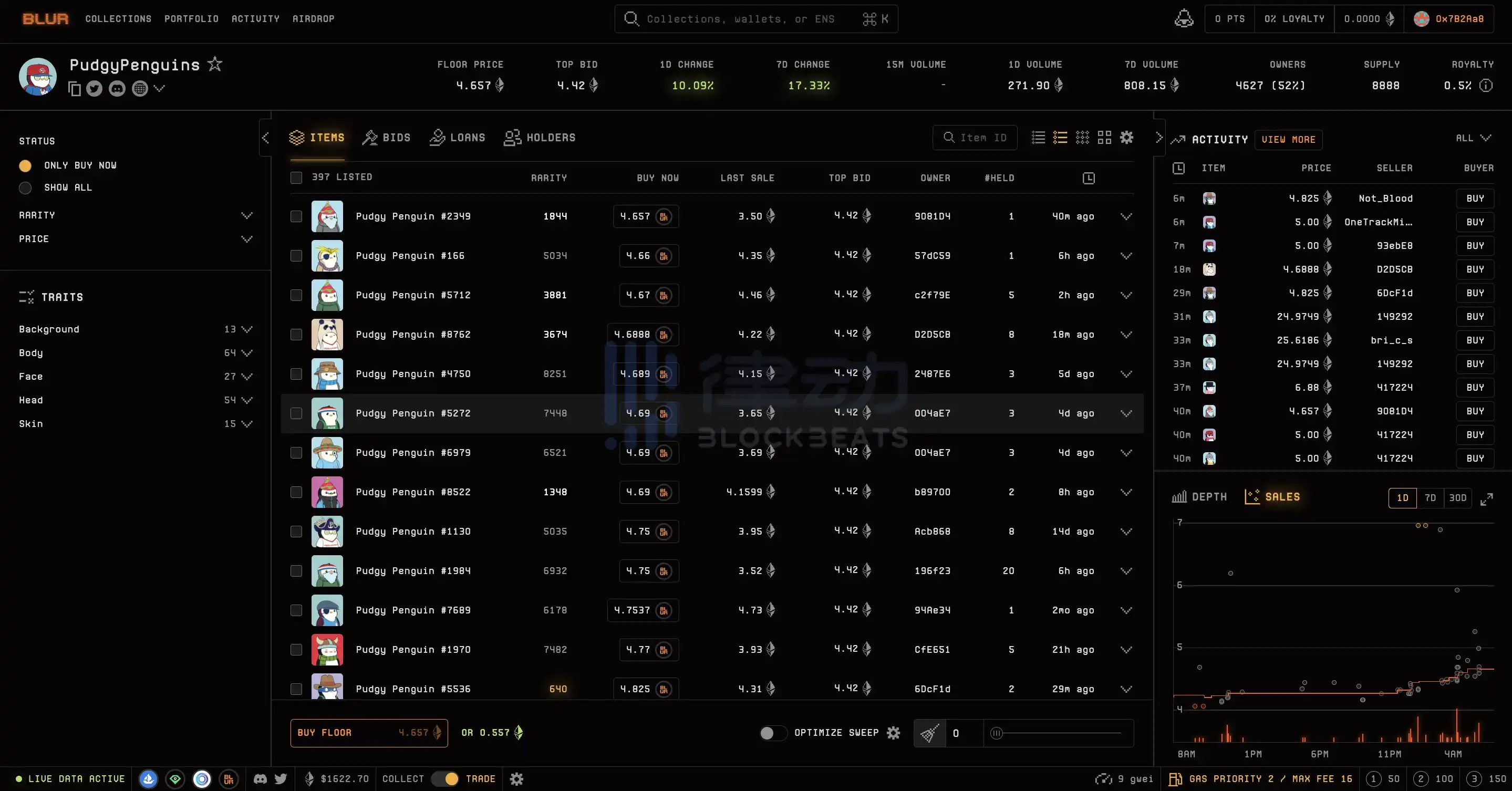 据 Blur 行情数据显示,NFT 项目「胖企鹅」Pudgy Penguins 地板价已回升至 4.657 ETH,24 小时涨幅 10.9%。此外,该系列 NFT 24 小时交易额达 271.9 ETH,约合 44.1 万美元。