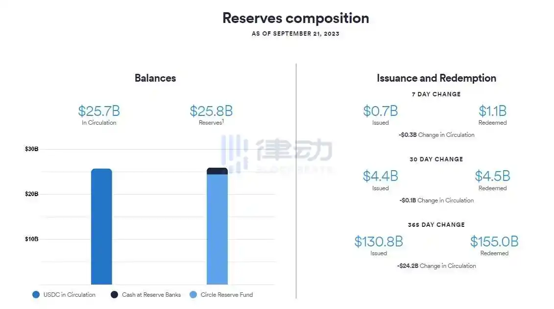 据 Circle 官网数据,自 9 月 15 日至 9 月 21 日,Circle 共发行约 7 亿枚 USDC,赎回约 11 亿枚 USDC,流通量减少近 3 亿枚。截止 9 月 21 日,USDC 流通量为 257 亿枚,储备资金为 258 亿美元。