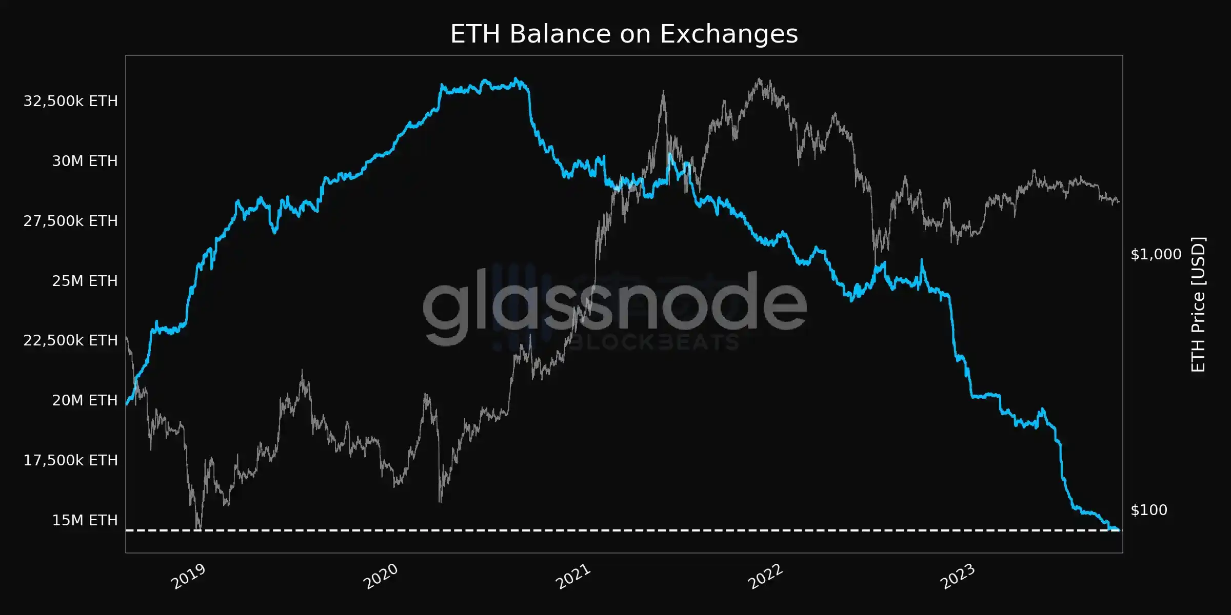 据 Glassnode 数据,交易平台以太坊余额达 14,551,400.379 枚,续创近 5 年新低。