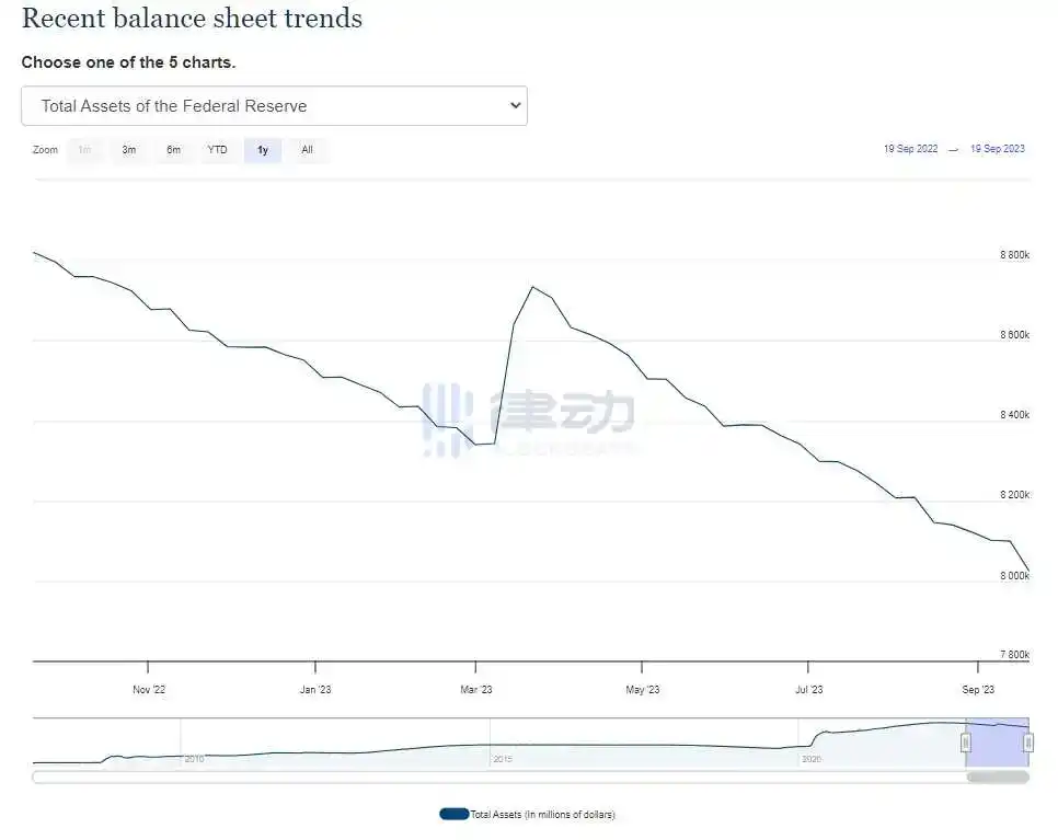 据美联储官网数据显示,截至 9 月 19 日,美联储资产负债表规模为 8.024 万亿美元,较此前一周的 8.09 万亿美元,单周缩表 746.89 亿美元。