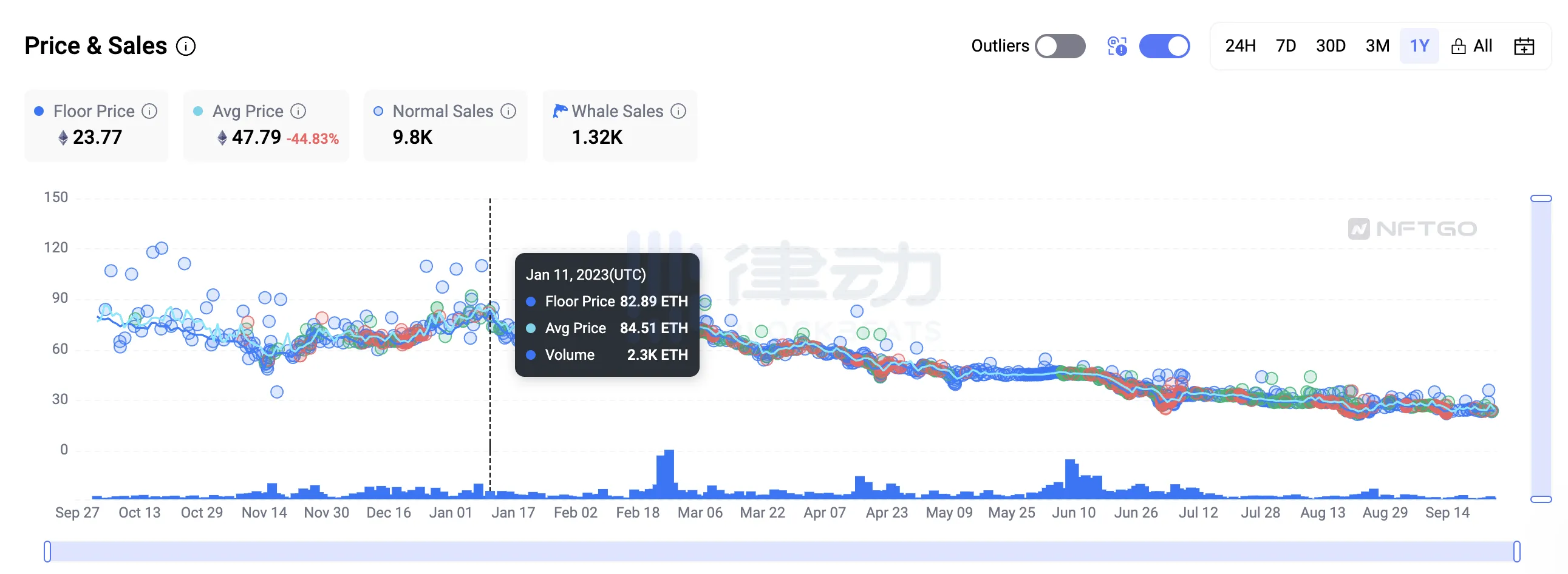 截至目前,根据 Blur 数据,BAYC 当前地板价为 23.77 ETH,较去年高点下跌超 70%。
