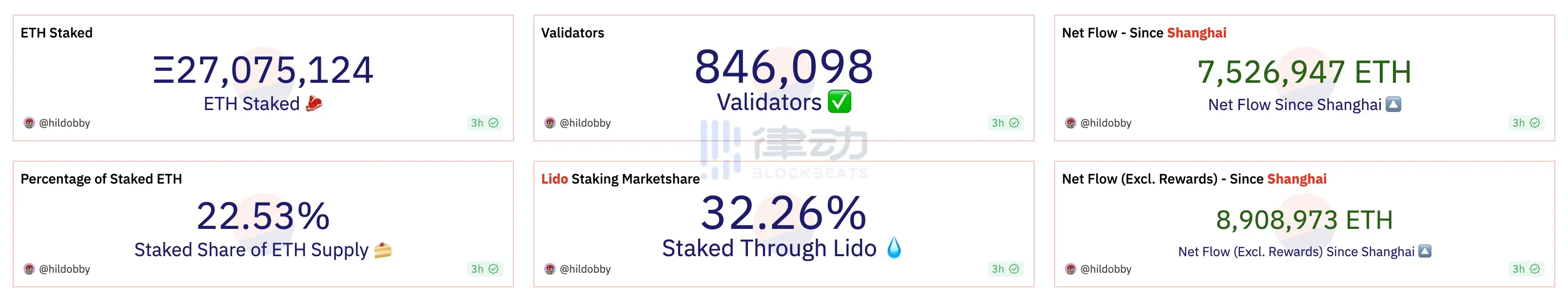 3. 以太坊信标链质押总量突破 2700 万枚 ETH,上海升级后净流入逾 752 万枚 ETH;