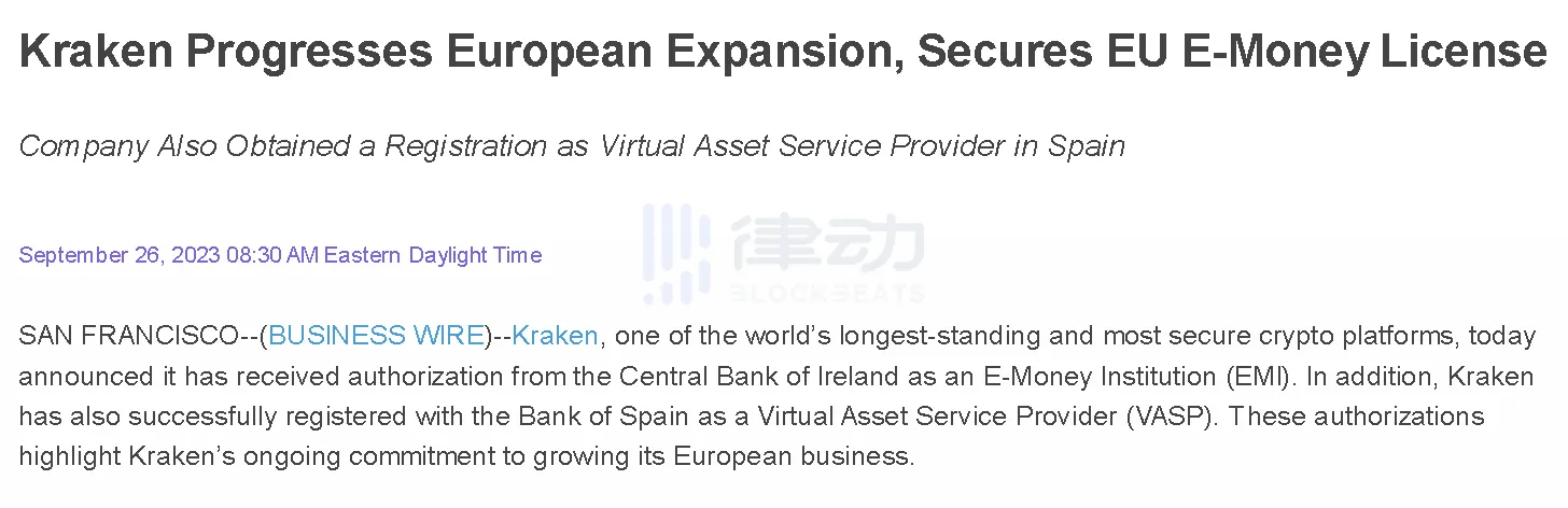 9 月 26 日,Kraken 宣布获得爱尔兰中央银行的电子货币机构(EMI)许可证,并在西班牙银行注册为虚拟资产服务提供商(VASP),使 Kraken 能够与欧洲银行合作扩大其欧元法定服务。此外,Kraken 的新 VASP 注册将使其能够向西班牙居民提供加密货币兑换和托管钱包服务。