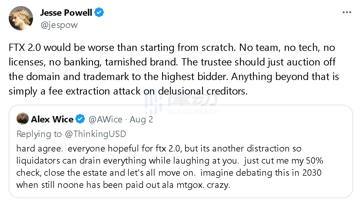 8 月 2 日,Kraken 联合创始人 Jesse Powell 针对 FTX 的 2.0 重启计划表示,FTX 2.0 将比从零开始还糟。他指出,FTX 2.0 没有团队、没有技术、没有许可证、没有银行合作,而且品牌已经受损。他建议,托管人应该将域名和商标拍卖给出价最高的竞标者。除此之外的任何事情都只是对妄想的债权人的费用提取攻击。