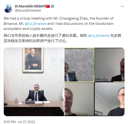 2022 年 5 月,彭博社报道土耳其正在制定立法,可能对涉及加密资产的一些交易进行征税。两个月后,土耳其财政部长 Nureddin NEBATİ 与 Binance 创始人 CZ 进行了视频会议,就区块链生态系统和加密资产进行了讨论。