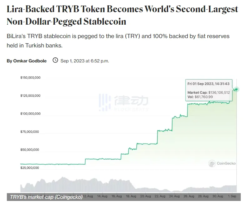 9 月 1 日,据 CoinDesk 报道,土耳其金融科技公司 BiLira 于以太坊网络上推出与土耳其里拉(TRY)挂钩的稳定币 TRYB 成为市值第二大非美元稳定币。据 CoinGecko 数据显示,TRYB 的市值在三周时间里飙升 325%,达到 1.361 亿美元。TRYB 成为全球第二大非美元稳定币,仅次于 Tether 推出的欧元稳定币 EURT,后者的市值为 2.24 亿美元。
