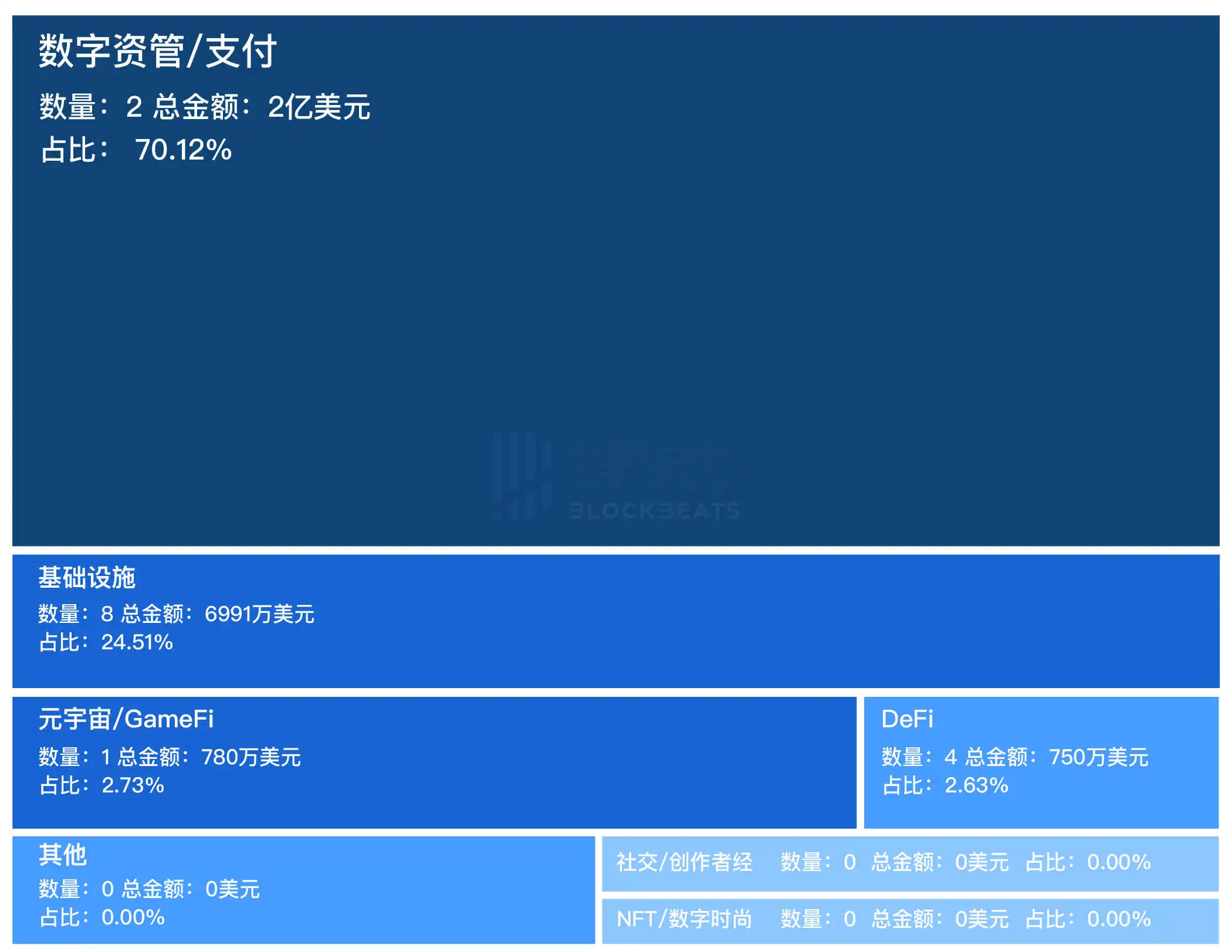 在数字资产管理/支付领域共计 2 笔融资,总金额超 2 亿美元,占上周融资总额的 70.12%。