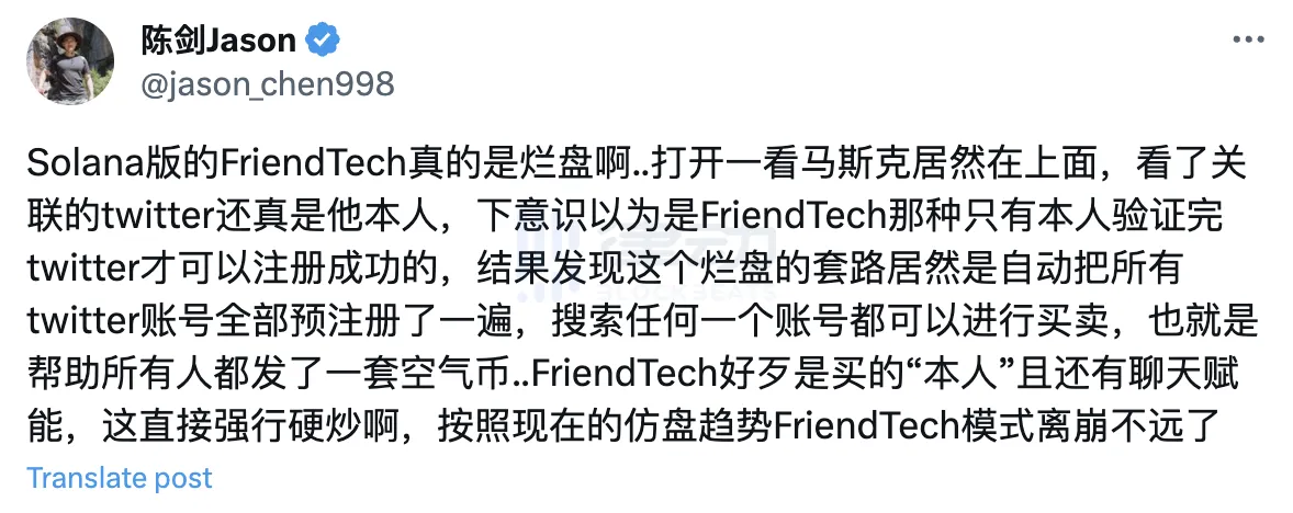 例如,加密行业 KOL@jason_chen998就在 X(原推特)上指出,依赖 Solana 的 FT 仿盘之一 FREINDZY「的套路是自动把所有 twitter 账号全部预注册了一遍,搜索任何一个账号都可以进行买卖,也就是帮助所有人都发了一套空气币」,存在「强行硬炒」的嫌疑,并认为仿盘太多会危及 FT 模式。