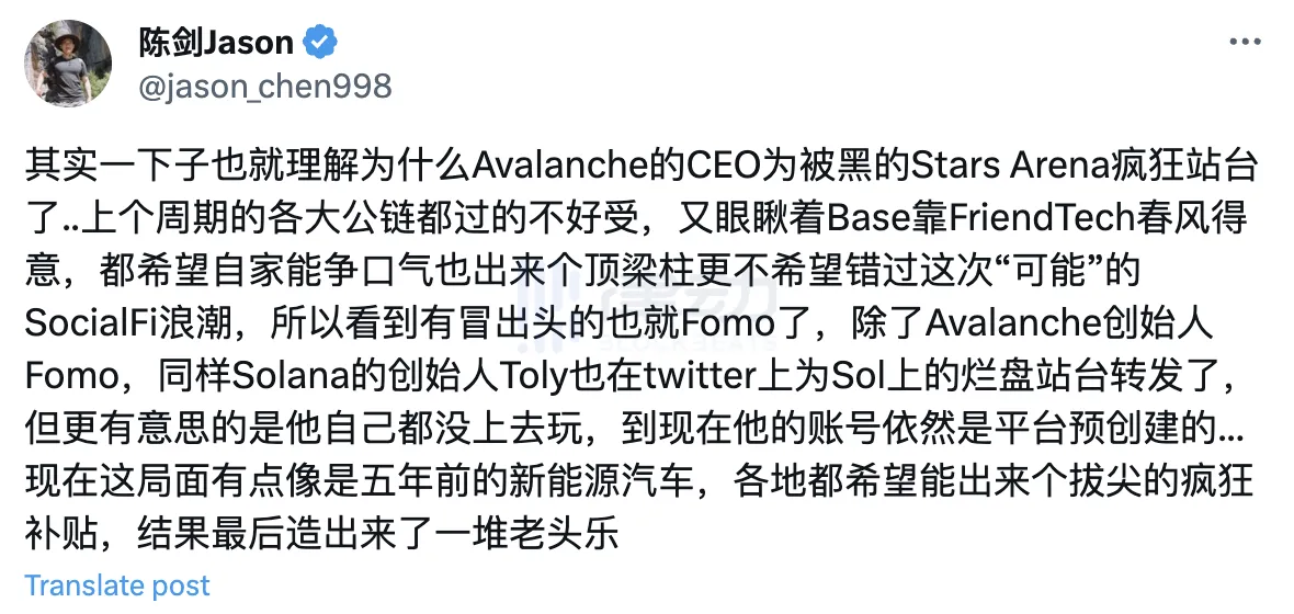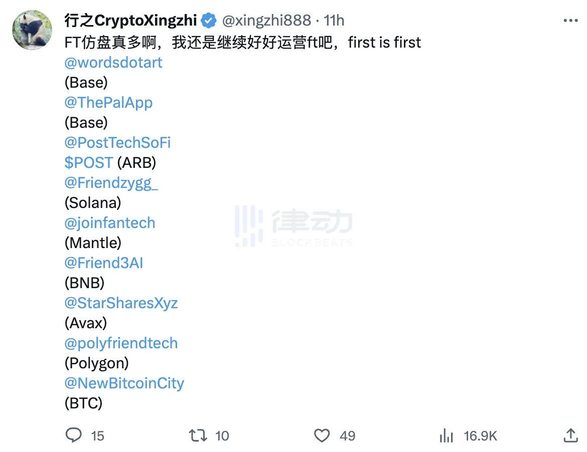 近来 FT 的持续火爆背后,或许藏着众多公链的集体焦虑。@jason_chen998发表动态指出,在当今的熊市行情下,FT 的火热也让各大公链持续「FOMO」。扎堆推出 FT 仿盘,或许也是不希望「错过『可能』的 SocialFi 浪潮」。