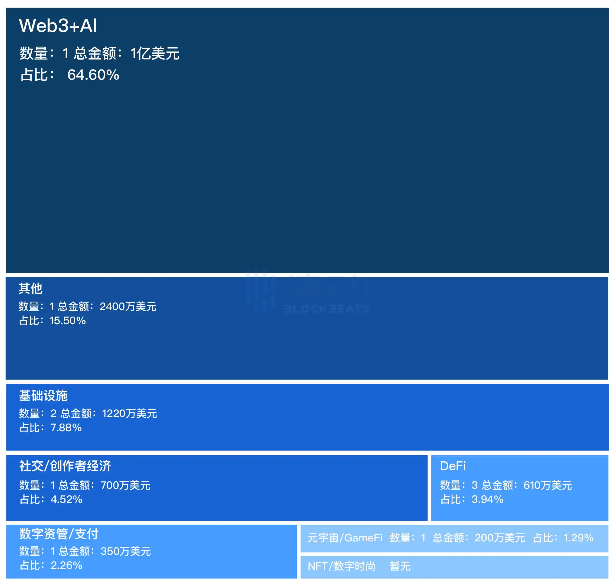 据 BlockBeats 统计,上周的融资总数为 10 笔,数量较之前有所下降,总金额约为 1.548 亿美元,平均融资金额为 1548 万美元。其中,Web3+AI 领域占据主体,其他领域融资相对较多,社交/创作者经济领域和基础设施领域增多,DeFi 领域、数字资管/支付领域和元宇宙/GameFi 领域较少,NFT/数字时尚领域暂无。下图为上周各板块融资占比: