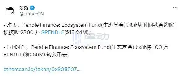 Pendle Finance 生态基金于 1 小时前将 100 万枚 PENDLE 转入 Binance