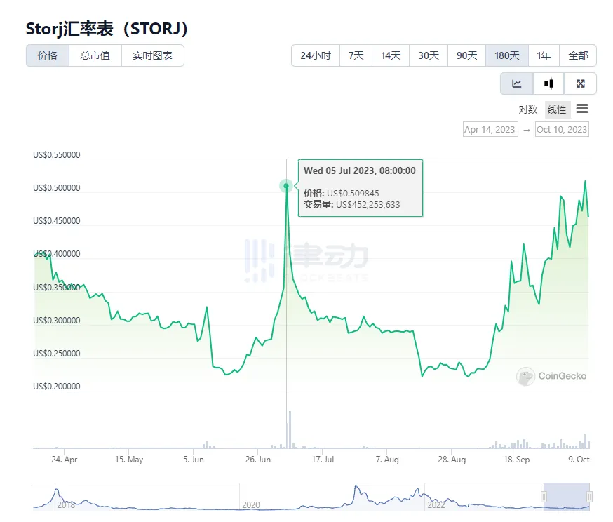 10 月 8 日,据 Lookonchain 监测,过去一个月,4 个新钱包从交易平台累计提出 4059 万枚 STORJ(约合 1972 万美元,占总供应量的 9.55%)。STORJ 价格近一个月涨幅超过 100%。