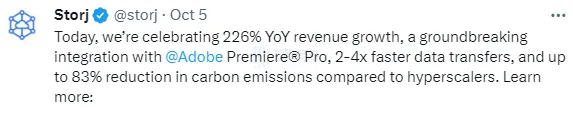 10 月 5 日,Storj 宣布收入同比增长 226%,并正式与视频编辑软件应用程序 Adobe® Premiere® Pro 集成。