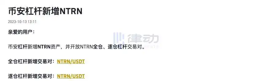 Binance 杠杆新增 NTRN 资产,并开放 NTRN 全仓、逐仓杠杆交易对