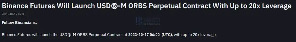 Binance 合约将上线 ORBS 20 倍 U 本位永续合约