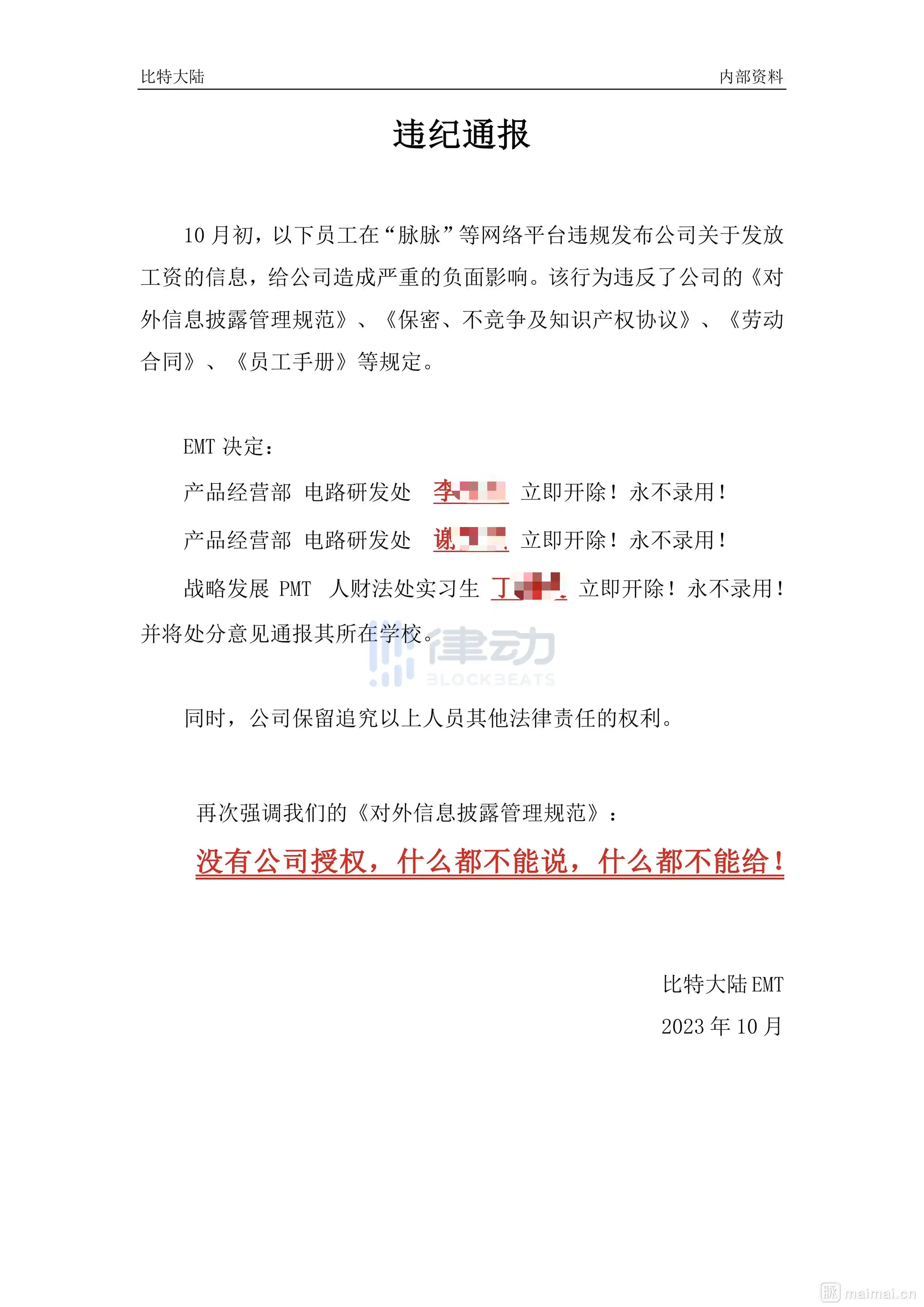 2. 比特大陆对三名「泄露工资拖欠」信息的员工予以开除处理;