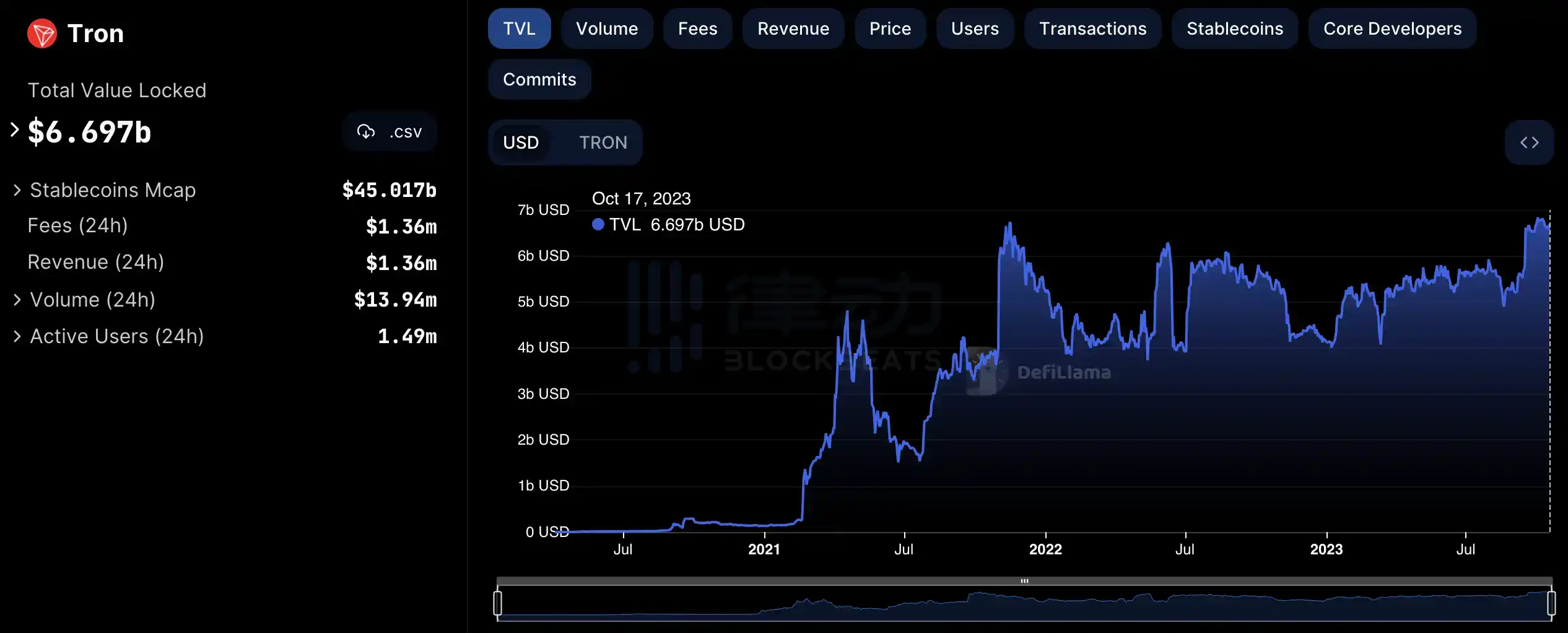 据 DefiLlama 数据显示,波场 TRON 总锁仓量(TVL)本月突破 68 亿美元,一度达到了 68.4 亿美元的峰值,创历史新高。截止发稿,其 TVL 已经小幅调整,回落至 66.97 亿美元。