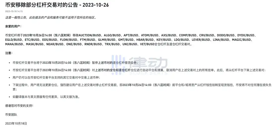 据官方公告,Binance 杠杆将于 2023 年 10 月 26 日 14:00(东八区时间)移除 AUCTION/BUSD、ALGO/BUSD、APT/BUSD、ATOM/BUSD、AXS/BUSD、COMP/BUSD、CRV/BUSD、DODO/BUSD、DYDX/BUSD、EGLD/BUSD、ETC/BUSD、EOS/BUSD、FLOW/BUSD、FTM/BUSD、GLMR/BUSD、GMT/BUSD、HBAR/BUSD、KEY/BUSD、LDO/BUSD、LEVER/BUSD、LINA/BUSD、MAGIC/BUSD、MANA/BUSD、MASK/BUSD、NEAR/BUSD、ONE/BUSD、RNDR/BUSD、TRX/BUSD、UNI/BUSD、VET/BUSD 全仓杠杆及逐仓杠杆交易对。其中: