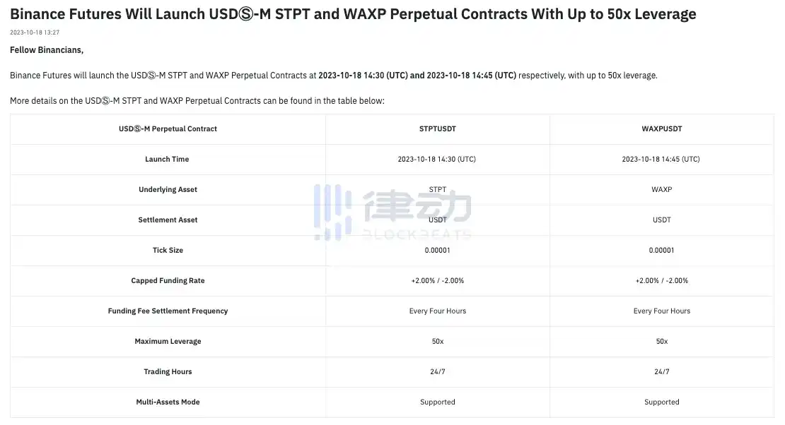 Binance 将上线 STPT 和 WAXP 1-50 倍 U 本位永续合约