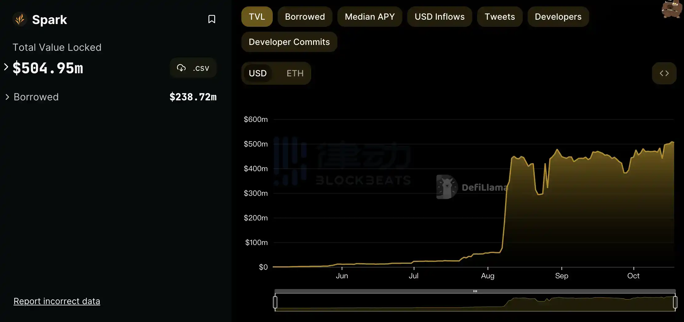 据 DefiLlama 数据信息,MakerDAO 旗下借贷协议 Spark Protocol TVL 突破 5 亿美元,达 5.04 亿美元。