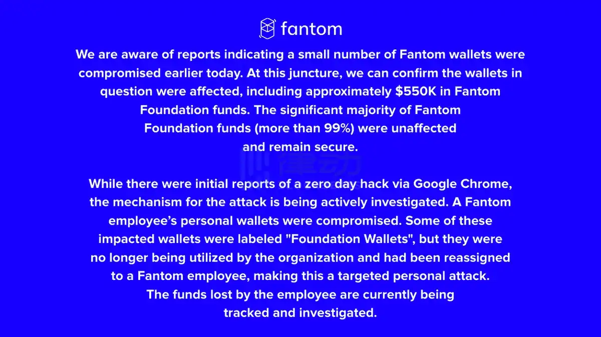 Fantom 基金会正式确认,此前有少数 Fantom 钱包被盗,其中包括约 55 万美元的 Fantom 基金会资金。尽管最初有报道称此次攻击是通过 Google Chrome 的零日漏洞进行的,但具体的攻击机制仍在积极调查中。