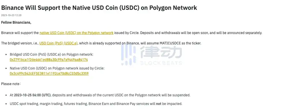 据官方公告,Binance 将支持由 Circle 在 Polygon 网络发行的原生 USD Coin(USDC)。该代币于上述网络的充值、提现业务将于近期开放。Binance 现已支持跨链版本 USD Coin (PoS)(USDC.e),并将采用 MATICUSDCE 作为代码。· Binance 将于 2023 年 10 月 25 日 14:00(东八区时间)暂停平台在 Polygon 网络现有的 USDC 充值、提现业务; · USDC 的现货交易、杠杆交易、合约交易、Binance 赚币及币安支付服务将不受影响。