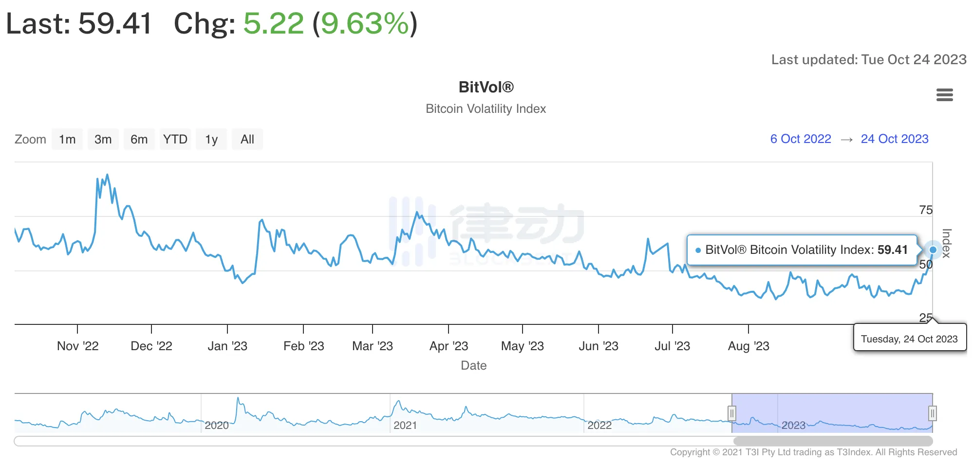 BlockBeats 消息,10 月 25 日,由金融指数公司 T3 Index 联合比特币期权交易平台 LedgerX 推出的 BitVol(比特币波动)指数昨日升至 59.41,日涨幅 9.63%。