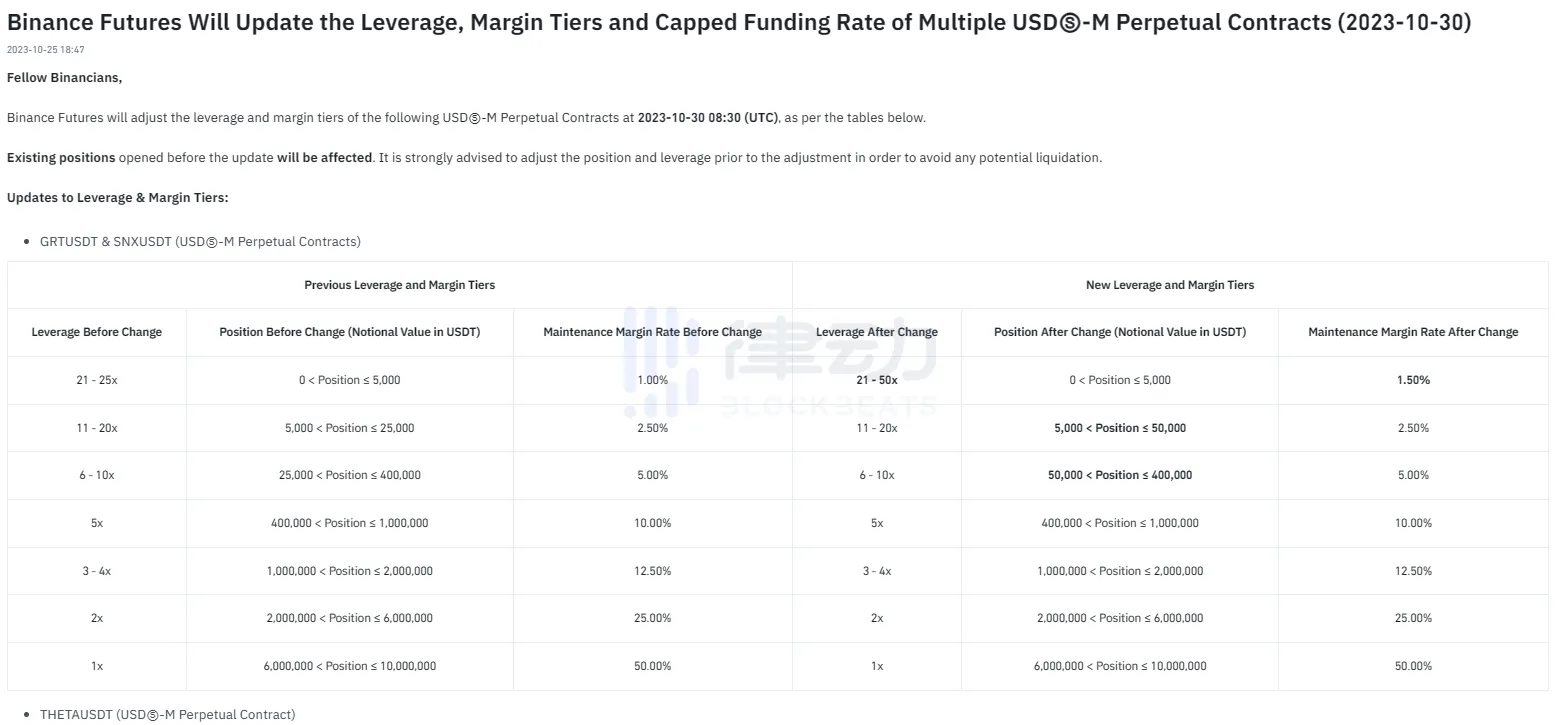 据官方公告,Binance 合约将于 2023 年 10 月 30 日 16:30(东八区时间)更新 GRT、SNX、THETA、CHZ、ZEC、IOTA、DASH、KNC、ZRX、AR、WOO、BAT、LRC、RVN 的 U 本位永续合约杠杆和保证金阶梯,用户当前仓位将受到影响。用户可参考更新后的杠杆和保证金阶梯调整保证金,以避免强行平仓。 上述 U 本位永续合约资金费率上限将于 2023 年 10 月 30 日 16:30(东八区时间)调整为+2.00%/-2.00%。