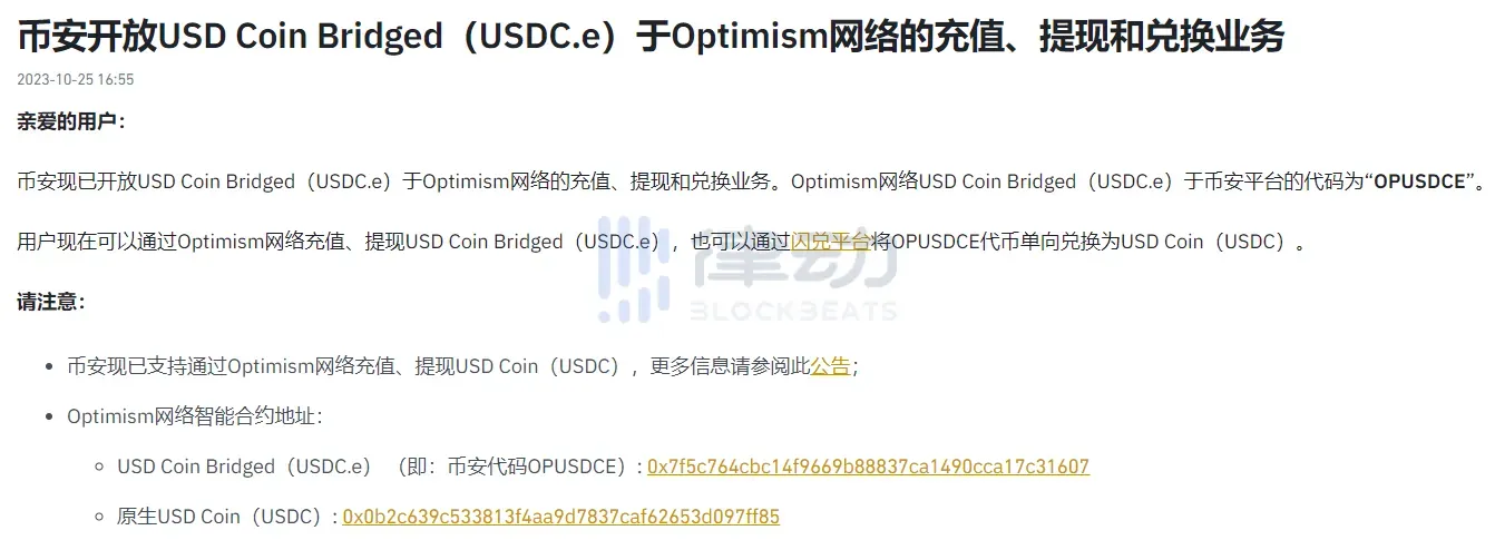 Binance 开放 USDC.e 于 Optimism 网络的充值、提现和兑换业务