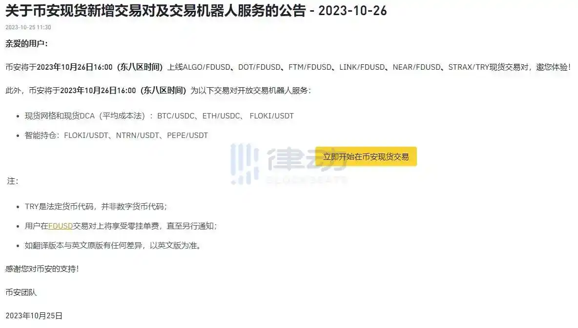 据官方公告,Binance 将于 2023 年 10 月 26 日 16:00 上线 ALGO/FDUSD、DOT/FDUSD、FTM/FDUSD、LINK/FDUSD、NEAR/FDUSD、STRAX/TRY 现货交易对。此外,Binance 将于 2023 年 10 月 26 日 16:00 为以下交易对开放交易机器人服务。现货网格和现货 DCA(平均成本法):BTC/USDC、ETH/USDC、 FLOKI/USDT;智能持仓:FLOKI/USDT、NTRN/USDT、PEPE/USDT。