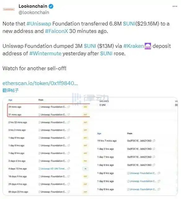 据 Lookonchain 监测,Uniswap 基金会于 30 分钟前再次转移 680 万枚 UNI(价值约合 2916 万美元),其中 340 万枚转移至新地址,另外 340 万枚转移至 FalconX。BlockBeats 昨日报道,Uniswap 基金会经中间地址将 400 万枚 UNI 转入 Wintermute 的 Kraken 充值地址。