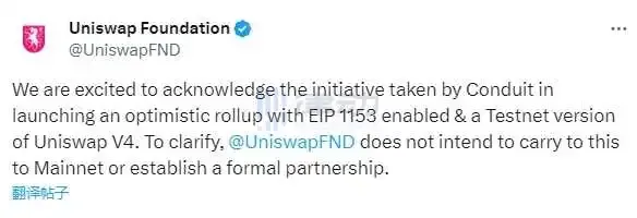 Uniswap 基金会:与 Conduit 推出的 Uniswap V4 沙盒并非正式合作,不会推广至主网