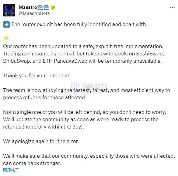 Maestro:已花费 610 ETH 全额退款受漏洞利用事件影响用户损失
