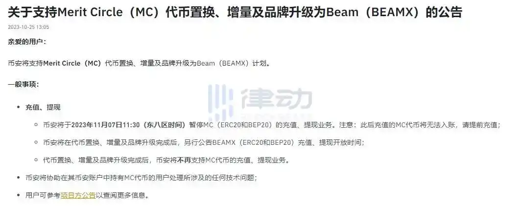 Binance 将支持 Merit Circle(MC)代币置换、增量及品牌升级为 Beam(BEAMX)