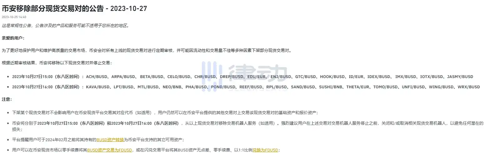 据官方公告,Binance 将移除以下现货交易对并停止交易: - 2023 年 10 月 27 日 15:00(东八区时间):ACH/BUSD、ARPA/BUSD、 BETA/BUSD、CELO/BUSD、CHR/BUSD、DREP/BUSD、EDU/EUR、 ENJ/BUSD、GTC/BUSD、HOOK/BUSD、ID/EUR、IDEX/BUSD、 IMX/BUSD、IOTX/BUSD、JASMY/BUSD - 2023 年 10 月 27 日 16:00(东八区时间):KAVA/BUSD、LPT/BUSD、MTL/BUSD、NEO/BNB、PHA/BUSD、POND/BUSD、REEF/BUSD、RPL/BUSD、SAND/BUSD、SUSHI/BNB、THETA/EUR、TOMO/BUSD、UNFI/BUSD、WING/BUSD、WRX/BUSD