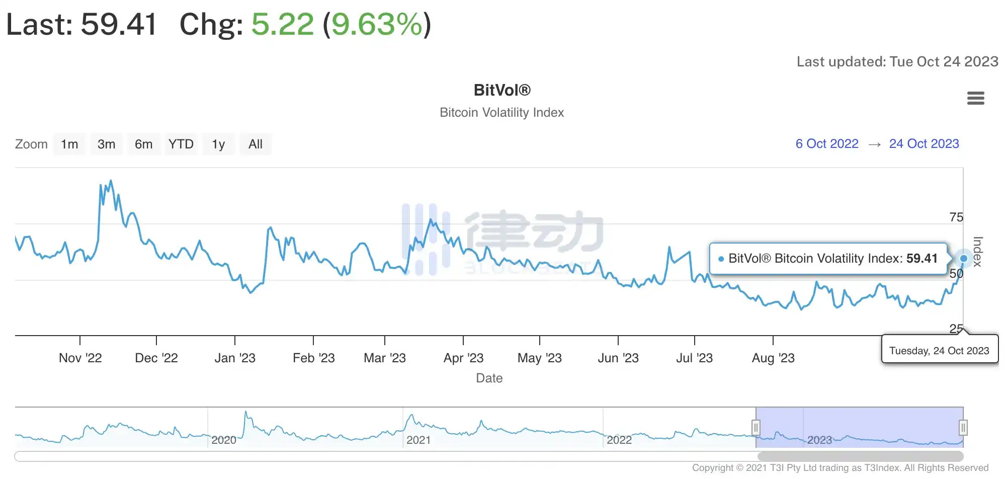 由金融指数公司 T3 Index 联合比特币期权交易平台 LedgerX 推出的 BitVol(比特币波动)指数昨日升至 59.41,日涨幅 9.63%。