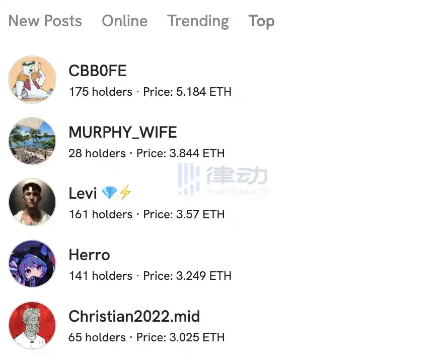 friend.tech「Keys」价格排行榜:加密 KOL CBB0FE 以 5.184 ETH 位列第一