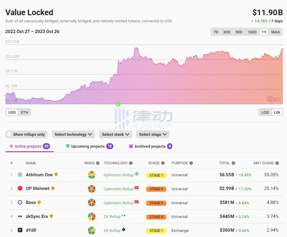 据 L2BEAT 数据显示,当前以太坊 Layer2 总锁仓量(TVL)升至 119 亿美元,7 日涨幅 14.78%,其中锁仓量前五分别为: Arbitrum One(655 亿美元,7 日涨幅 15.45%); OP Mainnet(299 亿美元,7 日涨幅 17.23%); Base(5.81 亿美元,7 日涨幅 6.84%); zkSync Era(4.45 亿美元,7 日涨幅 3.34%); dYdX(3.50 亿美元,7 日涨幅 5.60%)。