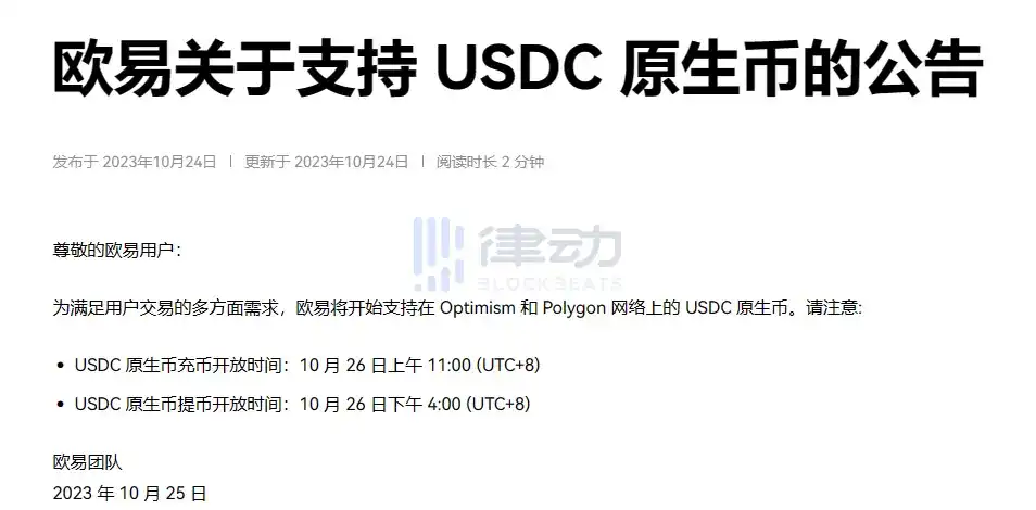 据官方公告,为满足用户交易的多方面需求,OKX 将开始支持在 Optimism 和 Polygon 网络上的原生 USDC。 - USDC 原生币充币开放时间:10 月 26 日上午 11:00 (UTC+8); - USDC 原生币提币开放时间:10 月 26 日下午 4:00 (UTC+8)。
