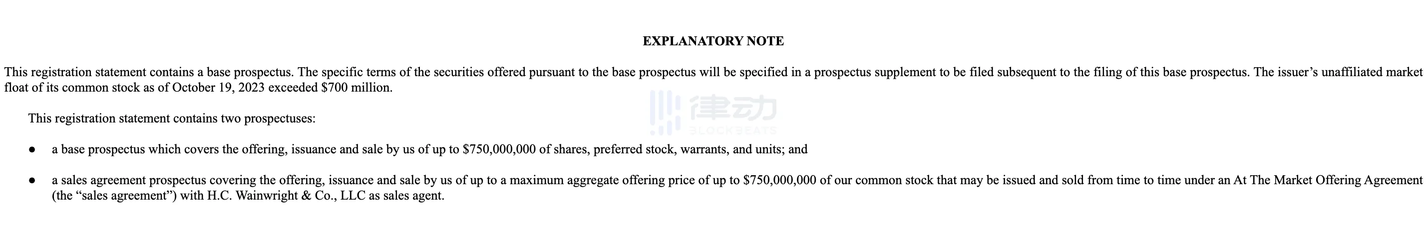 10 月 27 日,比特币矿企 Marathon Digital 向美国 SEC 提交 S-3 表格,计划通过混合股权发行募集最多 7.5 亿美元。Marathon Digital 表示:「我们可能会不时地在一项或多项发行中,按照在每次发行时确定的价格和条款,出售普通股、优先股、认股权证或者这些证券的组合,以获得最多 7.5 亿美元的初始发行总额。」