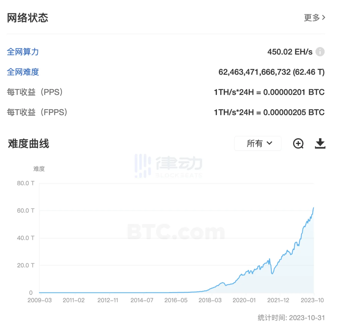 而近日矿企的接连活跃,一方面有自身发展因素。据 BTC.com 数据显示,当前全网算力为 450.02 EH/s,全网难度也达到了 62.46 T 的高度。摩尔定律(密集积体电路中的电晶体数量大约每 2 年增加 1 倍,这表示矿工升级新的 ASIC 会显著提高比特币产出数量的生产力)的背后,矿企必须不断购买性能更佳的矿机,以维持挖矿业务。