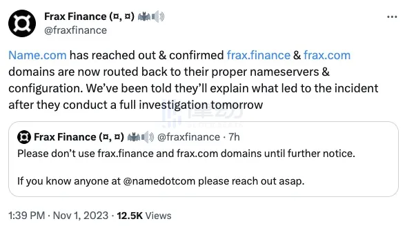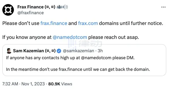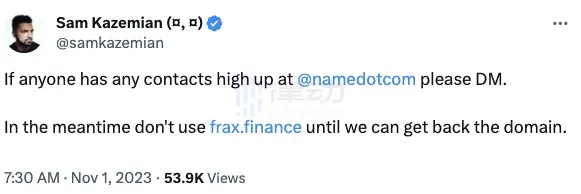 创始人 Sam Kazemian 发推称「如果有人有任何联系方式,请 @namedotcom 私信。同时,在我们取回域名之前不要使用 http://frax.finance。」