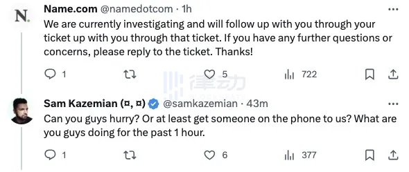 Sam 所呼叫的域名服务商 Name.com 在该条推文底下回应,表示正在调查。从 Sam 的回应中可以了解到,截止创始人紧急发布推文时,攻击事件可能已持续 1 小时。