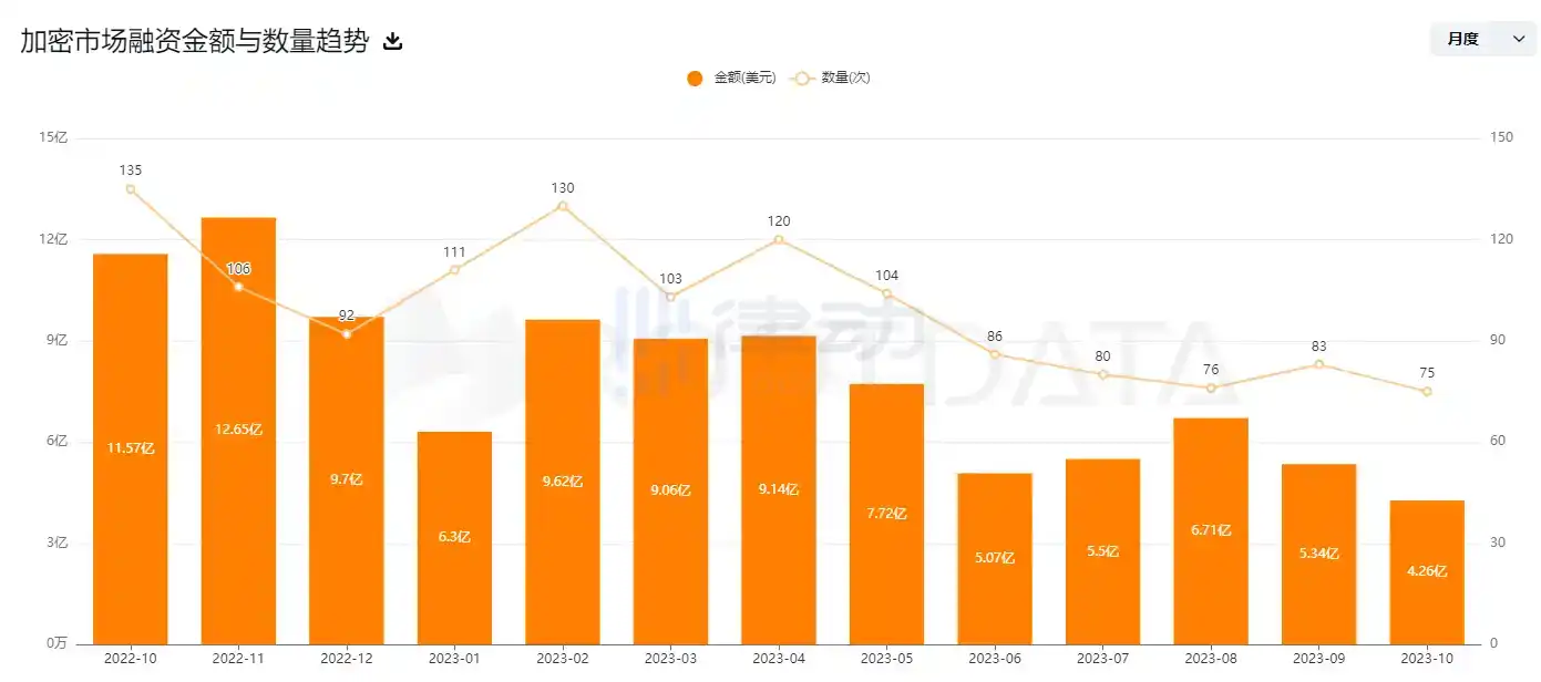 据 Rootdate 数据显示,2023 年 10 月加密领域共发生 75 笔融资,融资额累计约为 4.26 亿美元,是近 4 年来融资金额最低的月份,同比下降 63%。去年 10 月,加密领域共发生 135 笔融资,融资额累计约为 11.57 亿美元。