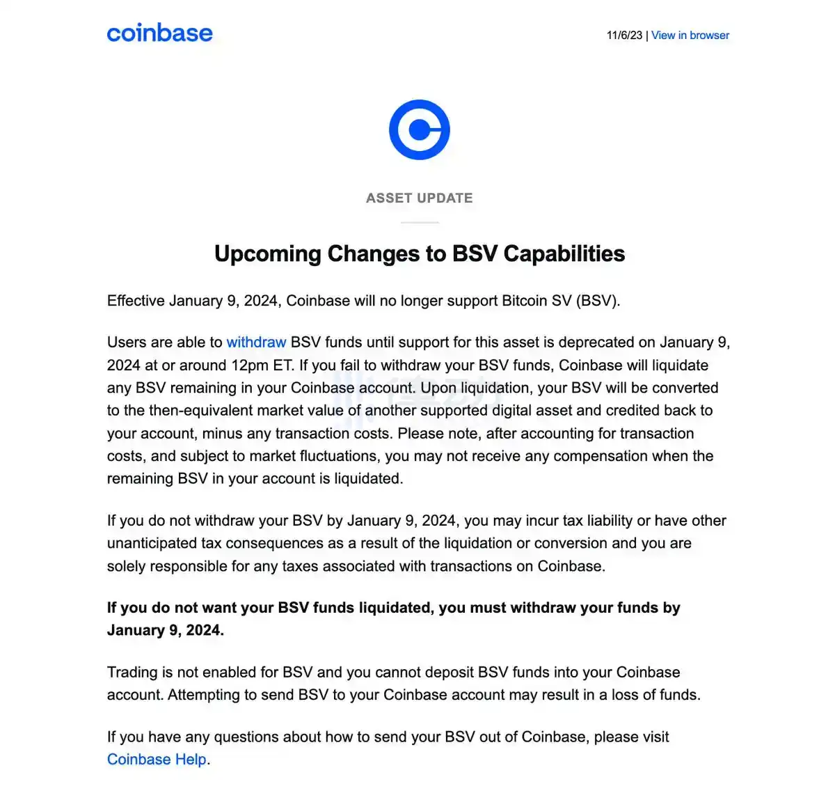 11 月 7 日,Coinbase 宣布将于 2024 年 1 月 9 日停止对 Bitcoin SV(BSV)的支持。用户需在此日期之前提取 BSV 资金,逾期 Coinbase 将自动将余额折算为等值的其他支持的数字资产,扣除交易成本后返还账户。未提取的 BSV 资金可能导致税务责任,用户需自行负责相关税费。