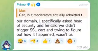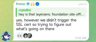 然而奇怪的是,Bryan(Primo)也承认了「layerzero.foundation」域名的确归 LayerZero 团队所有。Bryan(Primo)表示:「这确实是我们的域名,我特地询问了安全负责人,他说我们并没有添加 SSL 证书,他正在检查这究竟是如何发生的。」